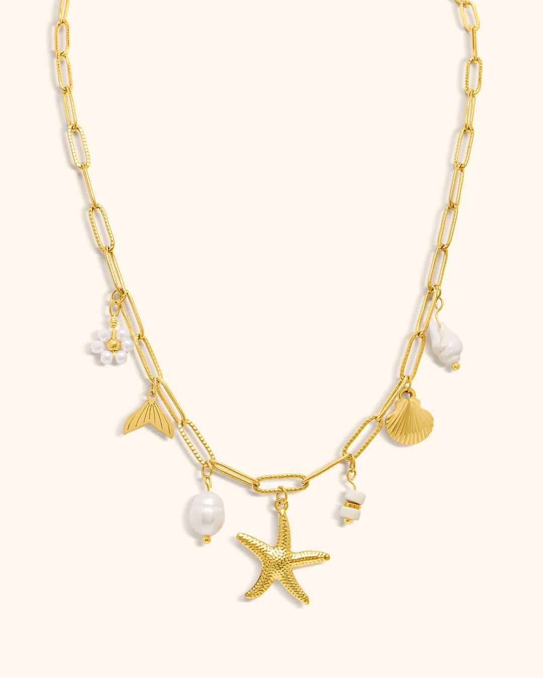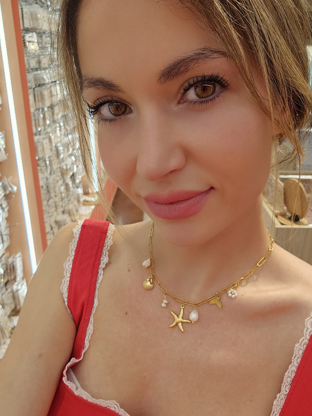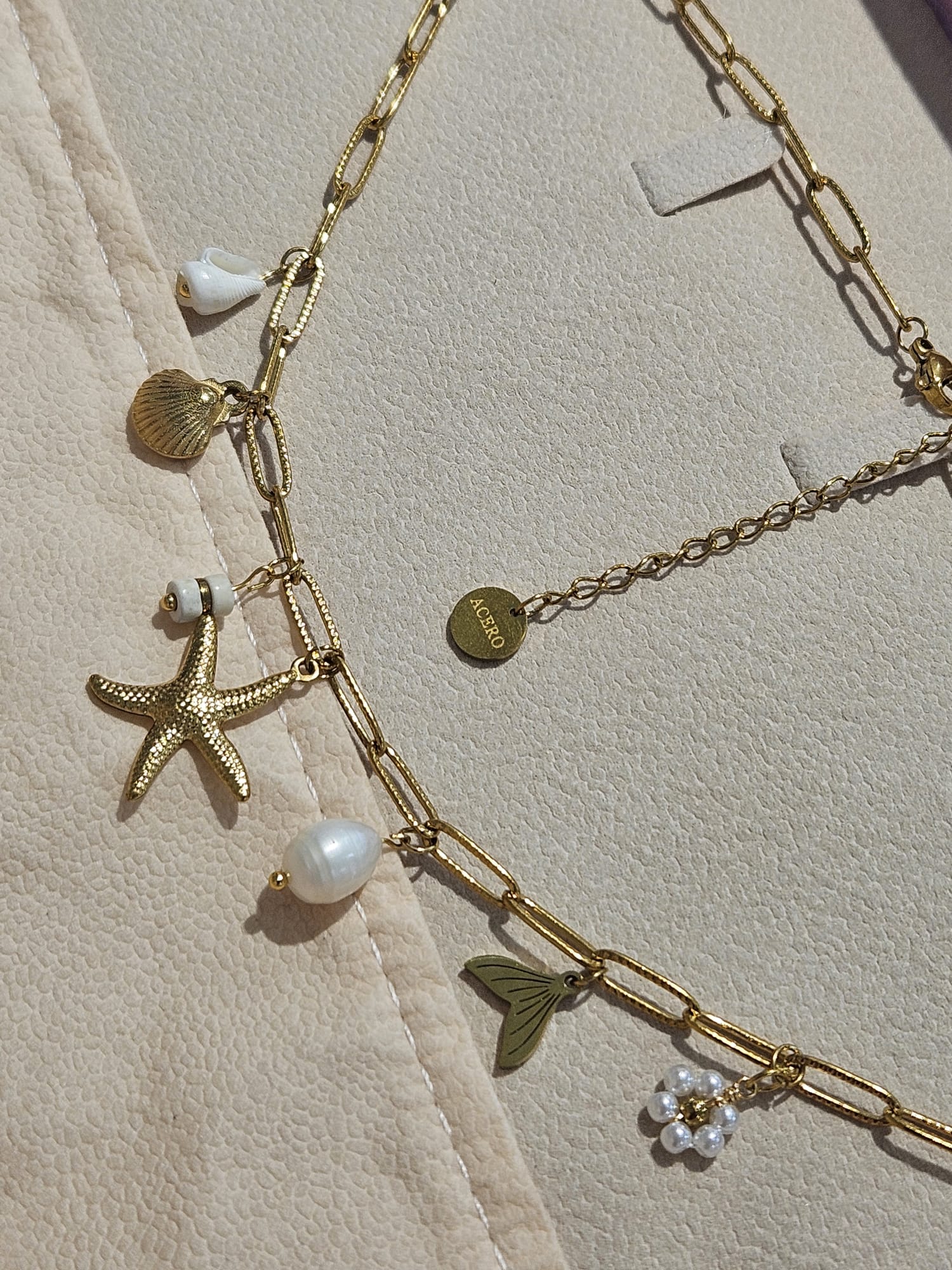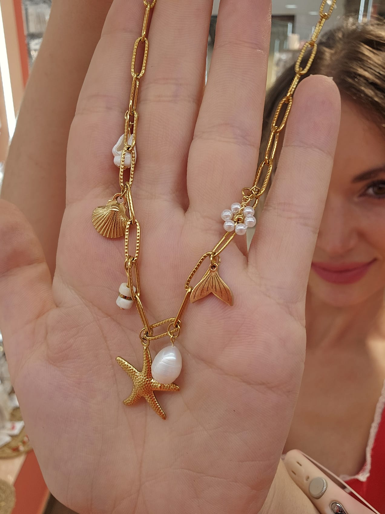 Un diseño único con colgantes de estrella de mar, concha, perla y más detalles que te transportan directo al verano.