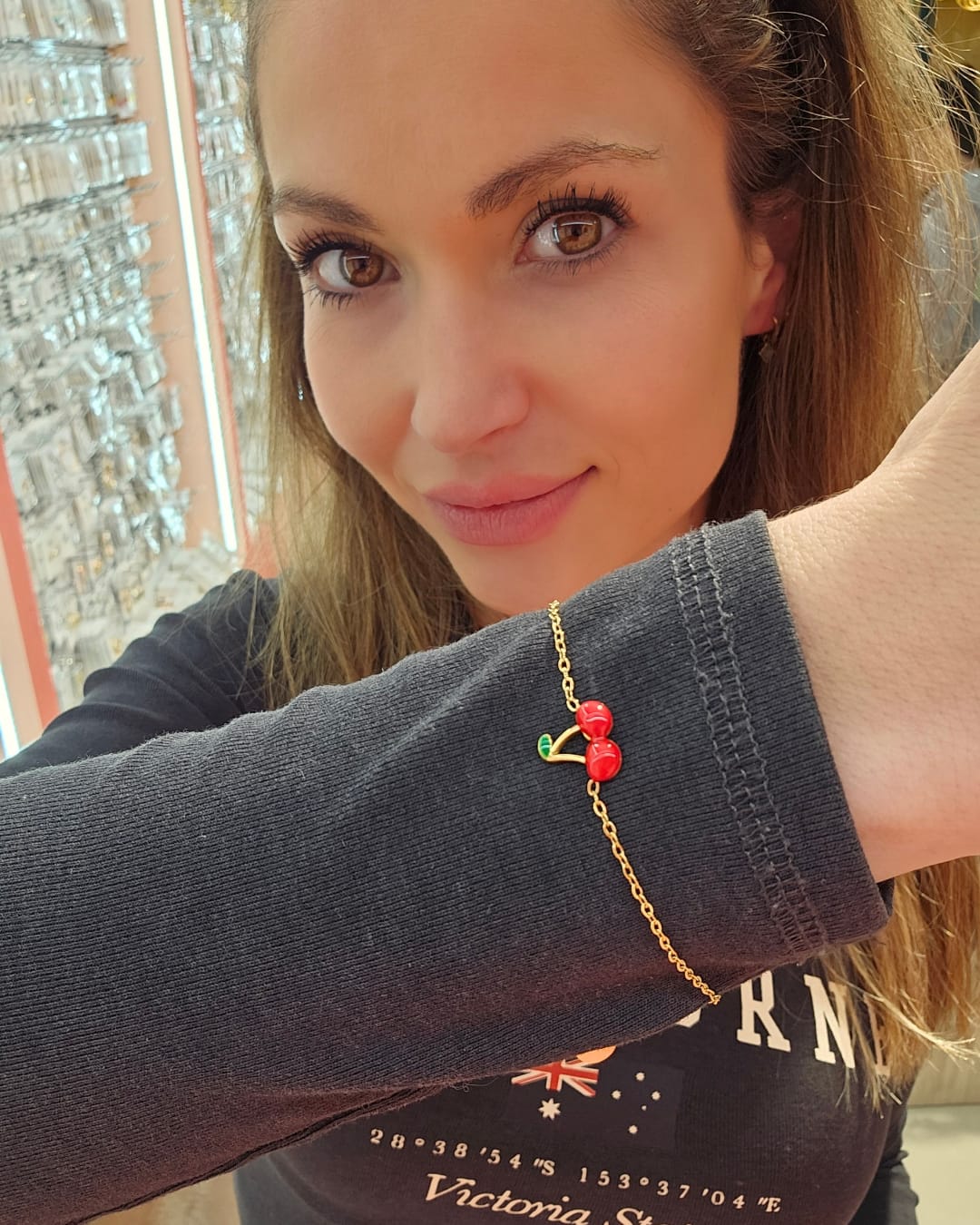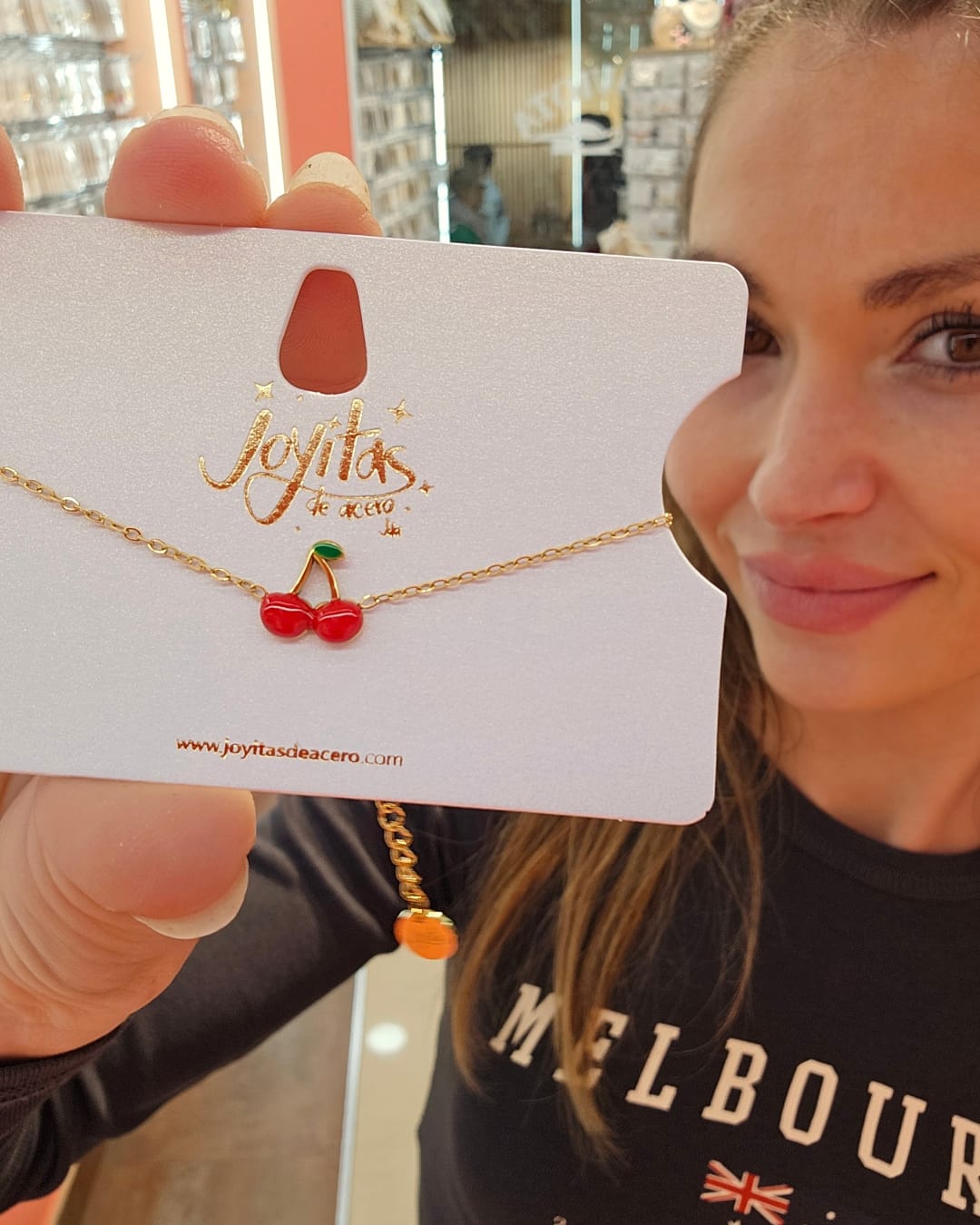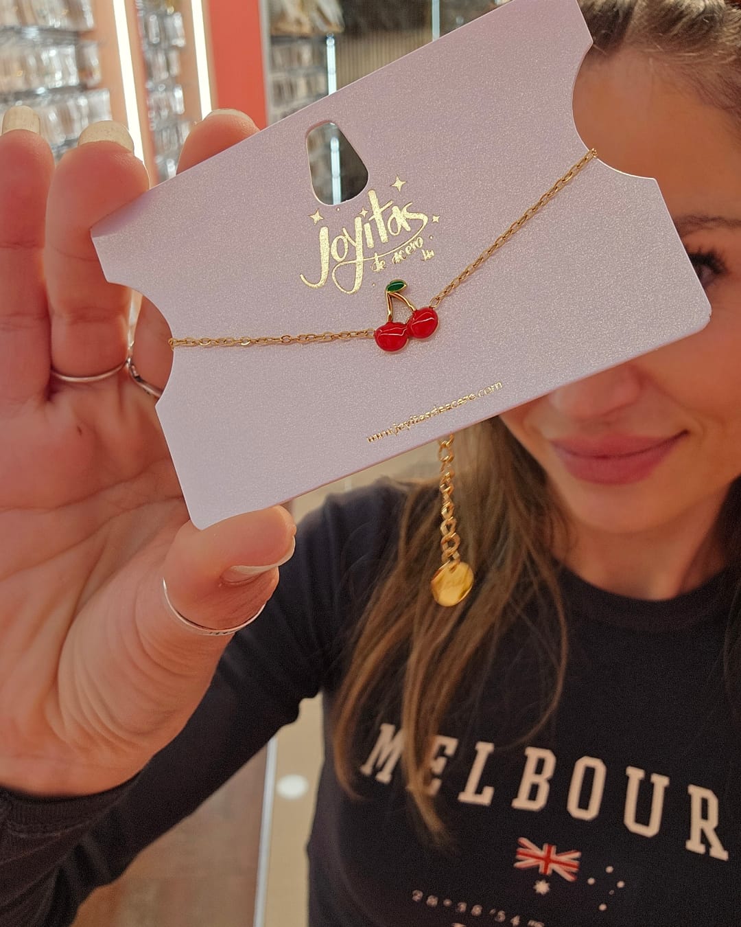 Esta pulsera de cerezas esmaltadas es el detalle perfecto para cualquier look. Añade un toque fresco y femenino, ideal para combinar con otras joyas o con el collar a juego. Es ligera y cómoda para llevar todo el día.